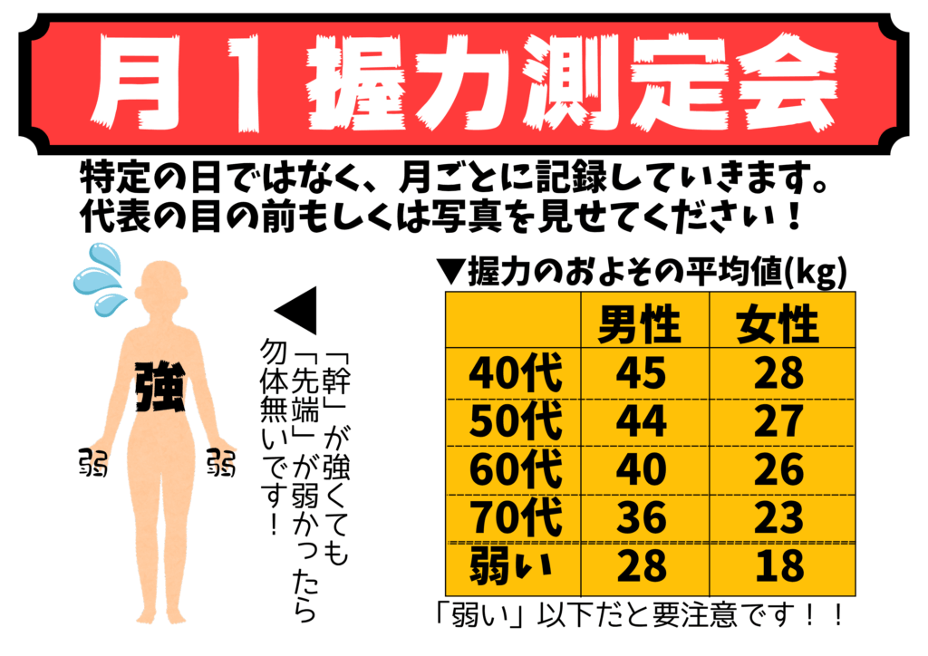 全身の筋力不足→握力の低下に反映されやすいので、1つの目安として握力を測定してみましょう。